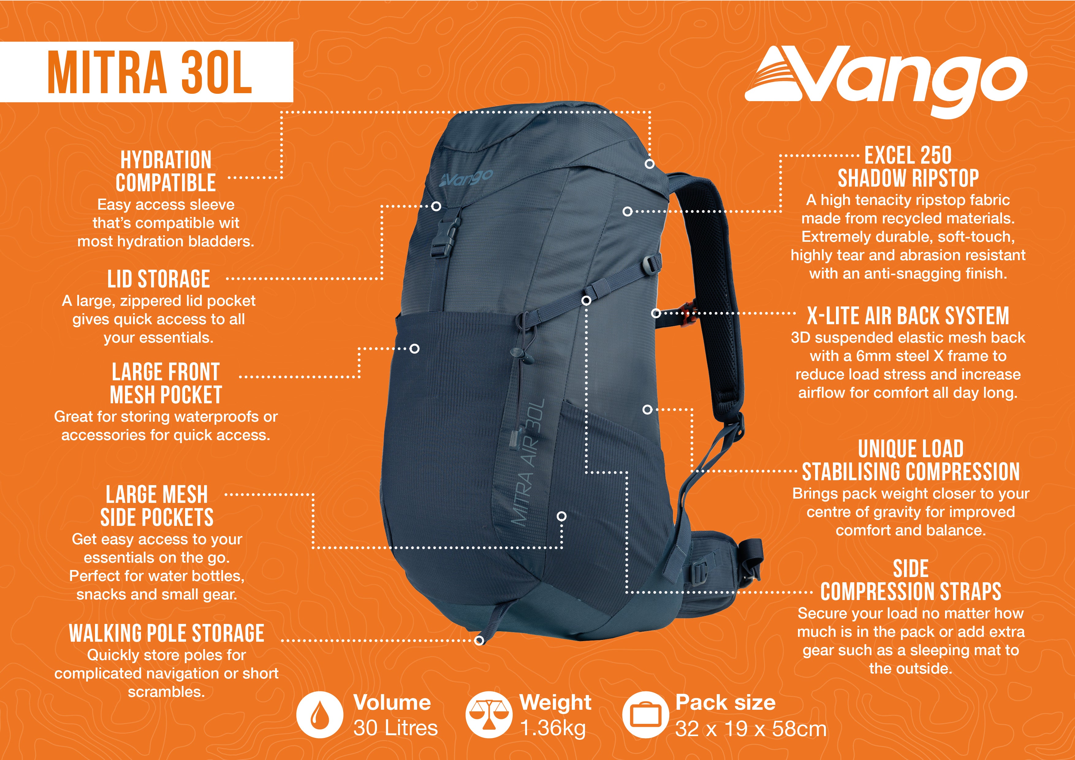 Experience ultimate comfort with the Vango Mitra air 30 litre Rucksack!