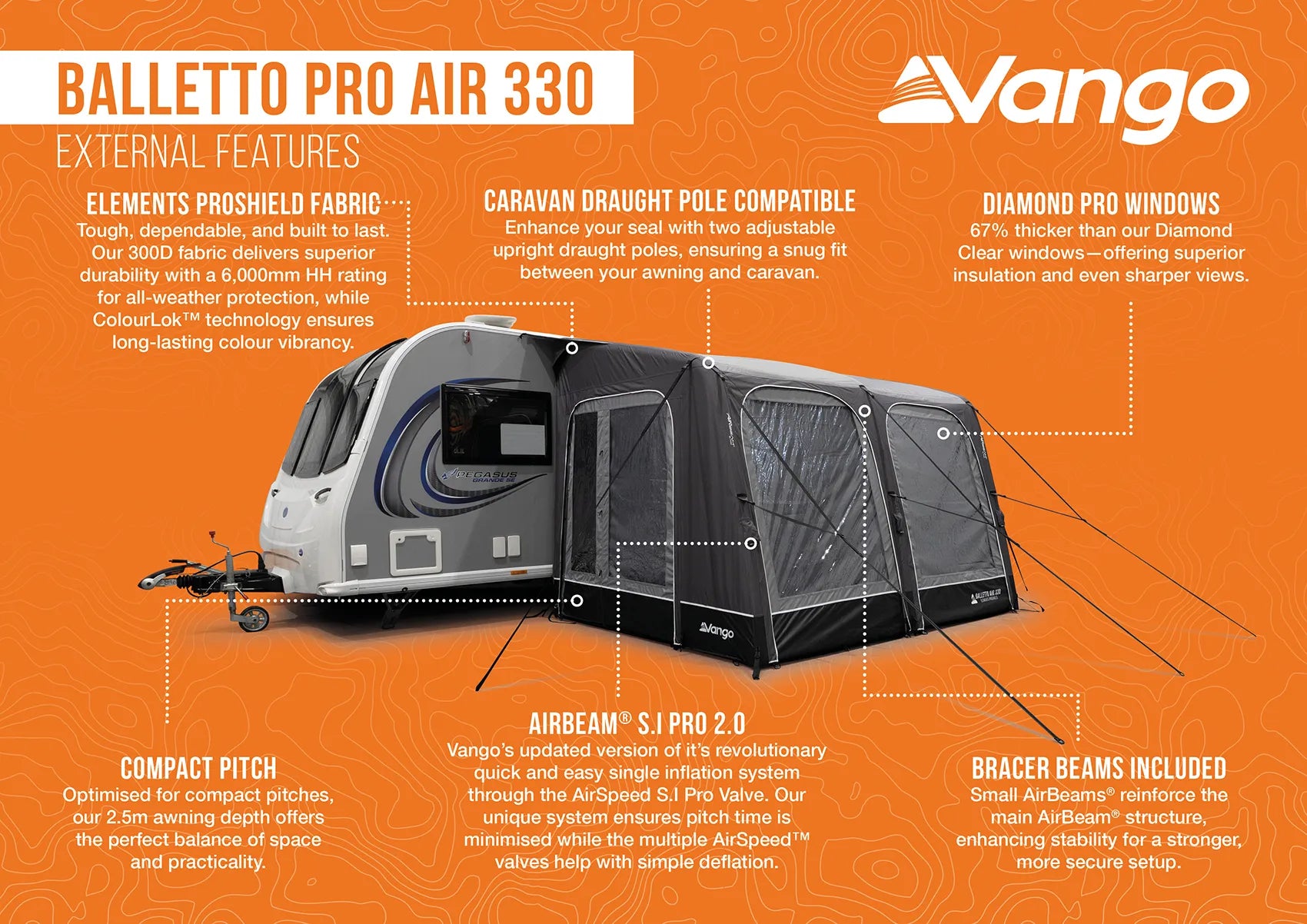The Vango Balletto Pro Air 330 is the versatile mid-size awning in the popular Balletto Pro Air range. Designed for touring families, it offers the perfect equilibrium between generous living space and rapid, straightforward pitching. Built with Vango’s proven AirBeam® technology and resilient Elements ProShield fabric, it provides a dependable and comfortable outdoor room that enhances every caravan and motorhome holiday.