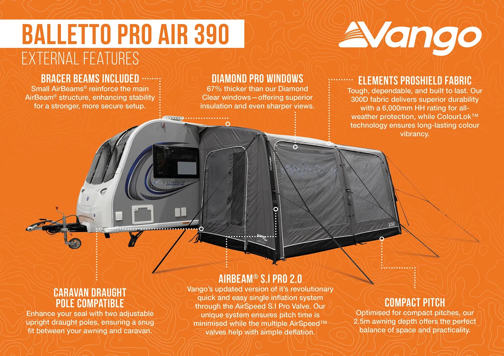 Designed for the touring enthusiast, the Vango Balletto Pro Air 390 is a premium inflatable awning that masterfully blends speed, space, and resilience. Engineered with Vango's latest technology and robust new Elements ProShield fabric, it creates a versatile and comfortable outdoor room for your caravan or motorhome, transforming your pitch into a perfect holiday retreat in minutes.