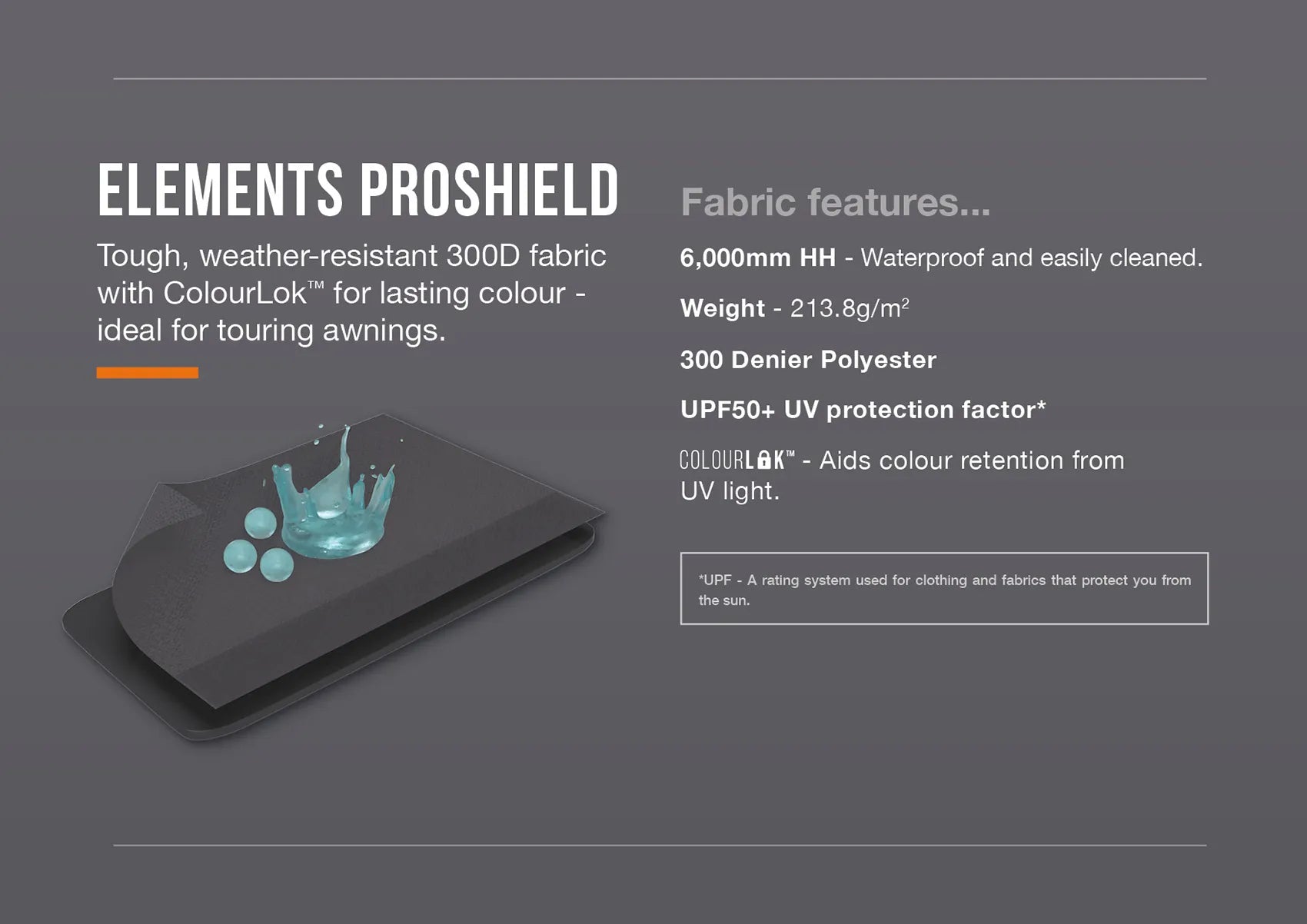 Constructed from Vango's dependable 300D Elements ProShield fabric, this awning is built to withstand the elements on your touring adventures. It offers a high 6,000mm hydrostatic head rating for reliable waterproofing. The integrated ColourLok™ technology actively resists fading from UV exposure, ensuring your awning looks vibrant trip after trip.