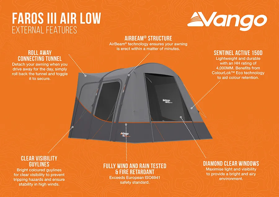 The Vango Faros 3 Air Low Driveaway Awning is the ultimate space-expanding solution for owners of popular low-profile campervans. Engineered for the touring lifestyle, it perfectly balances a compact, portable pack size with a practical and durable living area. Whether you need a dry storage space for gear, a comfortable seating area to relax, or a bug-free dining space, this awning extends your vehicle's comfort without complicating your adventure.