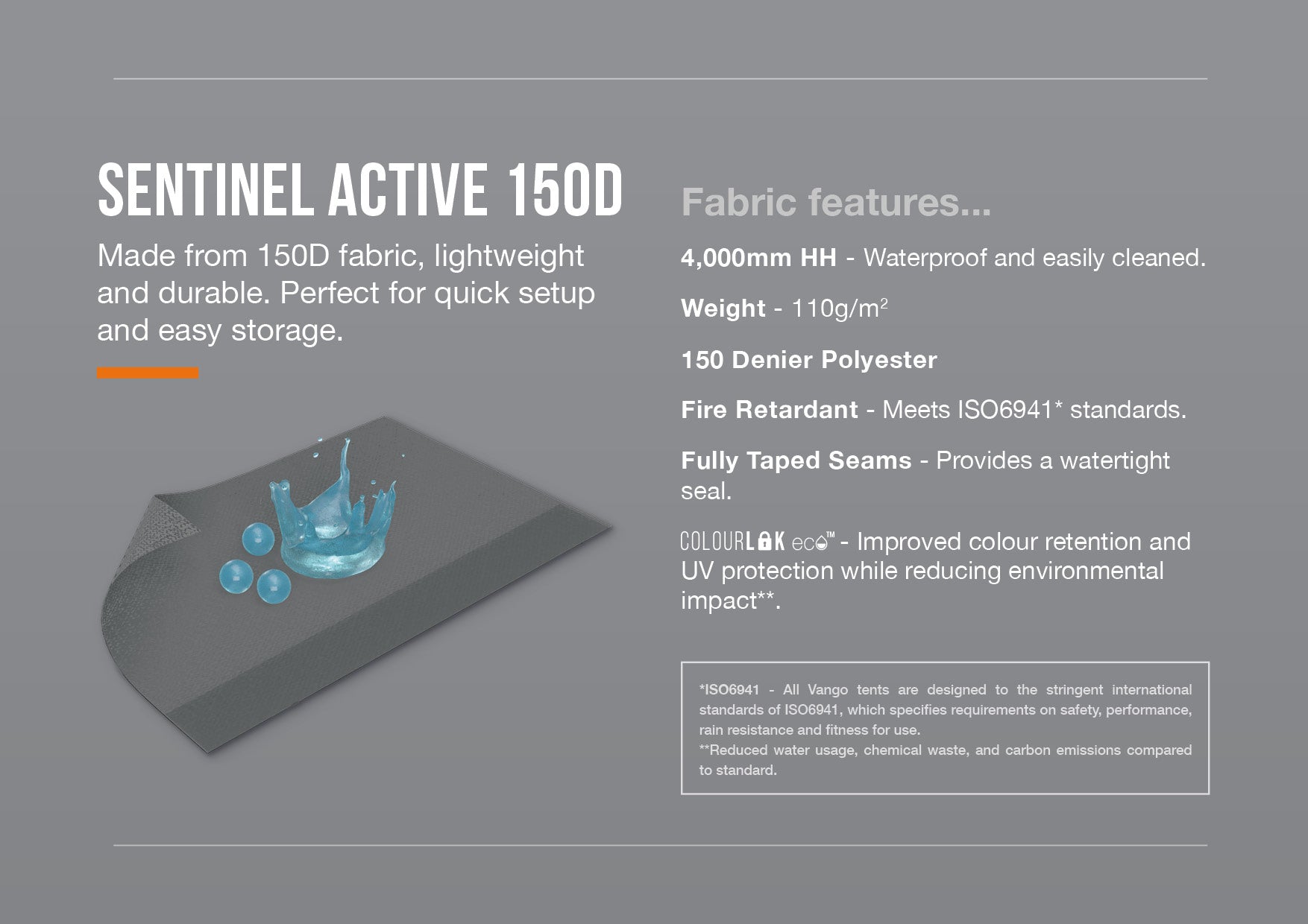 - Confidence in Changeable Weather: The Sentinel Active 150D polyester fabric provides robust durability and a high 4000mm hydrostatic head rating for reliable waterproofing. ColourLok™ Eco technology helps the fabric resist UV fading, preserving its appearance trip after trip. In windy conditions, the patented TBS®II (Tension Band System) braces the structure at three key points to minimise sideways movement and maintain stability.