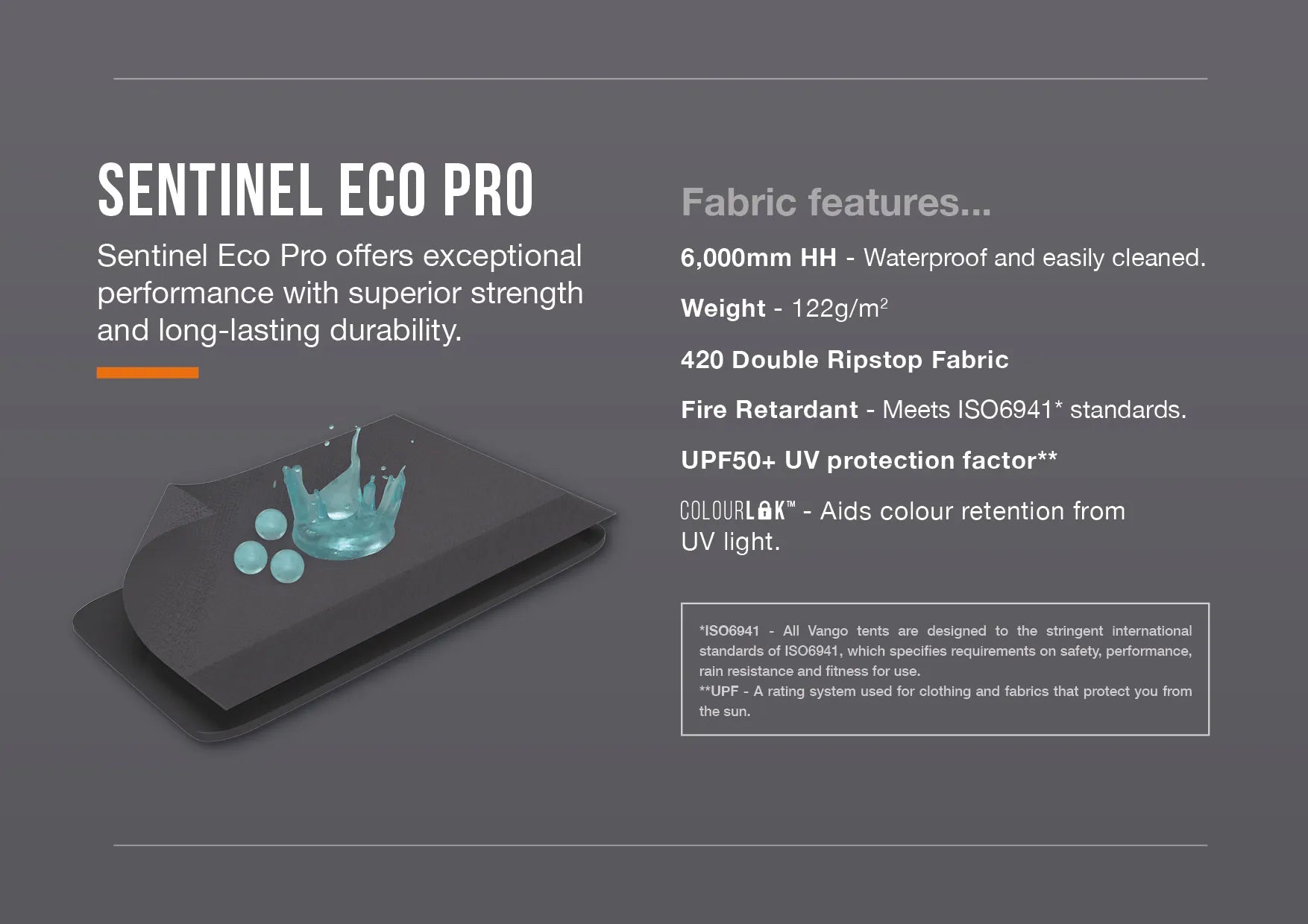 Built for touring enthusiasts who demand quality, this awning is constructed from Vango’s Sentinel Eco Pro Fabric. This robust material features 420 double ripstop threads, providing immense strength and durability. With a waterproof Hydrostatic Head rating of 6,000mm and ColourLok™ technology to aid colour retention, the Kela Pro is designed to withstand the elements while maintaining its premium look.